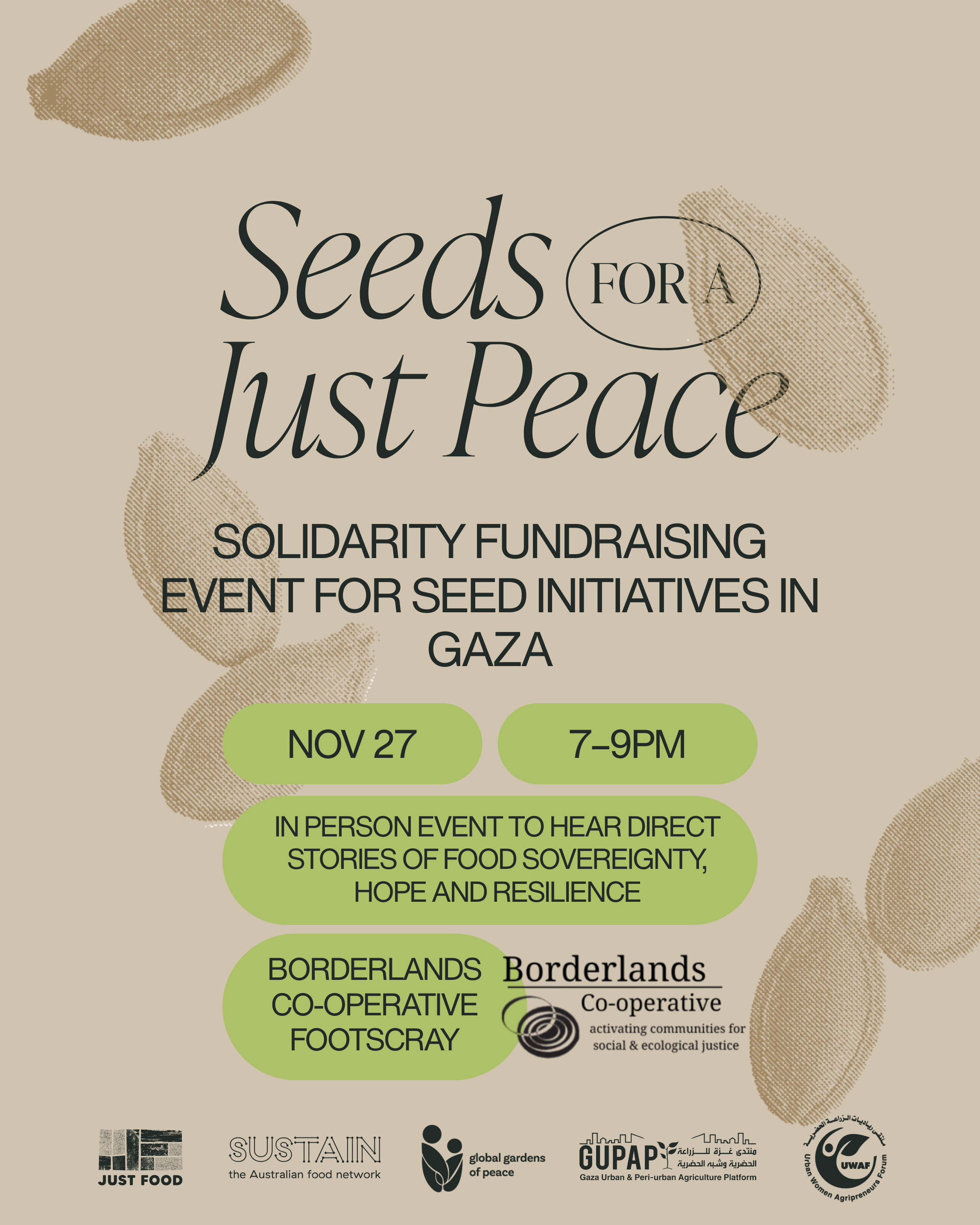 In partnership with Borderlands Cooperative, join us to hear direct stories of food sovereignty, hope and resilience from a number of speakers across Melbourne/Naarm and Gaza, as well as Egypt and other places of forced displacement.